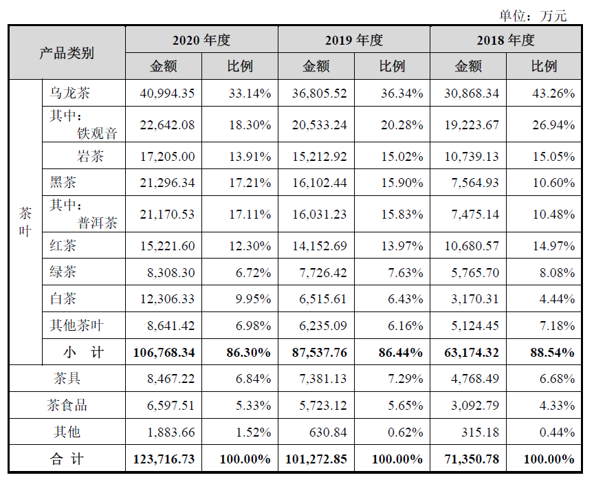 一是八马茶业产品线主要依托于定制产品,以此降低存货规模。八马茶业定制成品茶占采购金额比例从2018年的39.05%上升到2020年的47.42%。乌龙茶作为八马茶业的看家产品,近两年营收占比不断下降,从43.26%下降到33.14%。而外购的黑茶与白茶占比则分别从10.48%、4.44%上升到17.11%、9.95%。