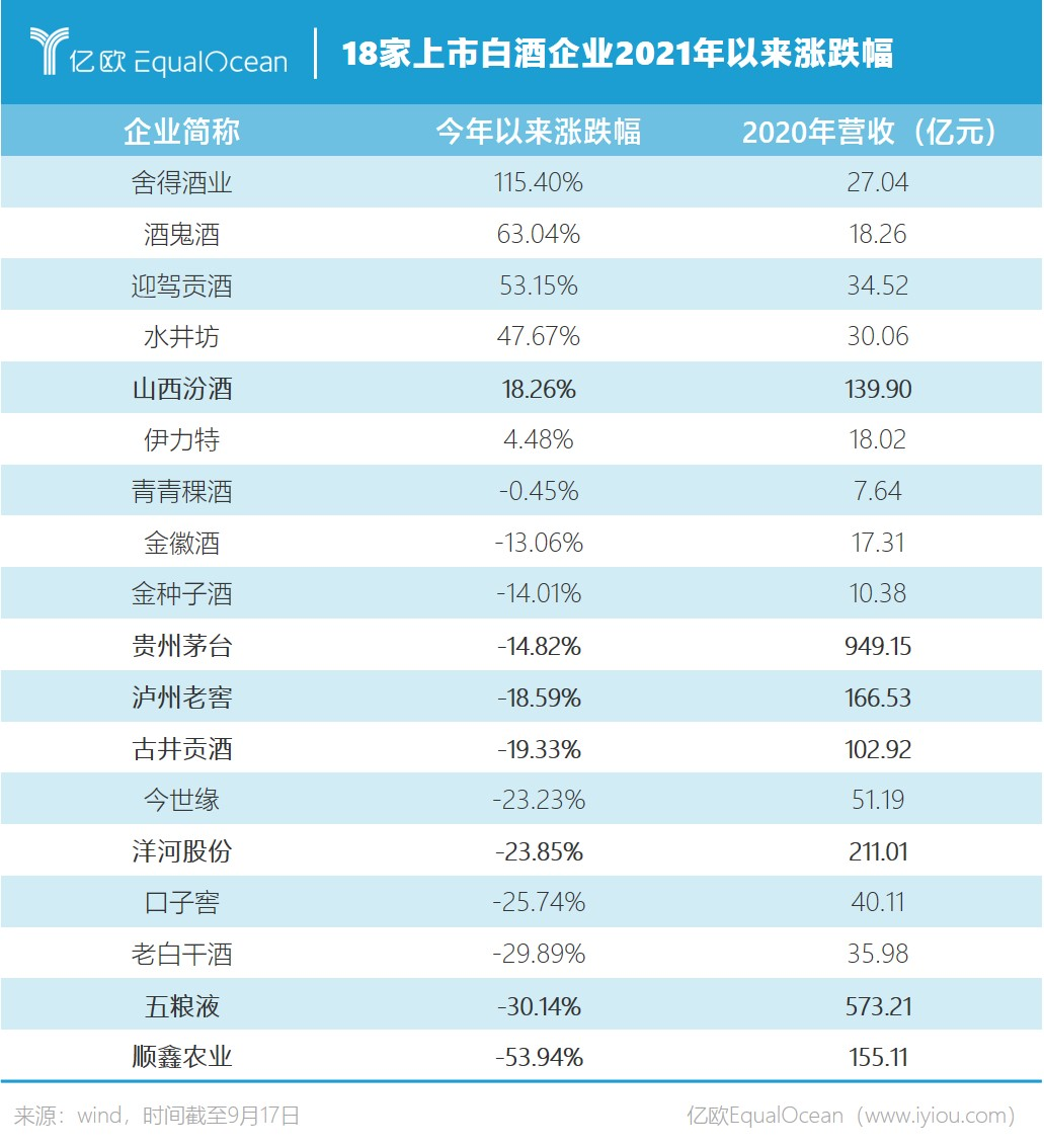 不过,从18只白酒股今年以来的市场表现来看,腰部企业整体状态都较头部企业好。其中,舍得酒业、酒鬼酒、迎驾贡酒、水井坊截至9月17日收盘涨幅分别为115.40%、63.04%、53.15%、47.67%。舍得酒业涨幅位居18家上市白酒企业之首。