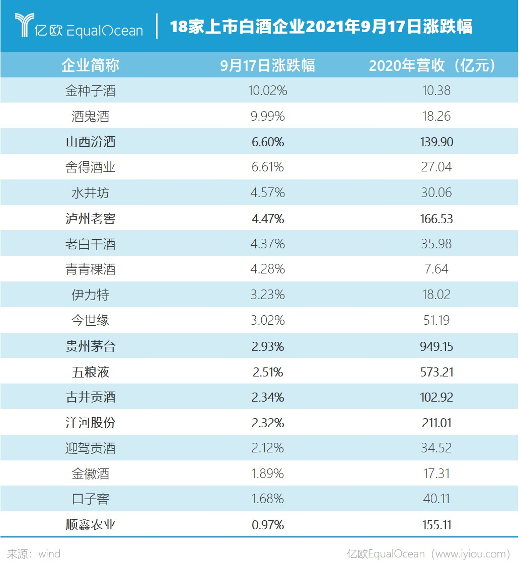 涨幅居首位的安徽酒企金种子酒,在18家企业中的业务实力并不突出,其2020年全年营收为10.38亿元。截至9月17日收盘,其市值为109.79亿元,仅有贵州茅台的1/200。