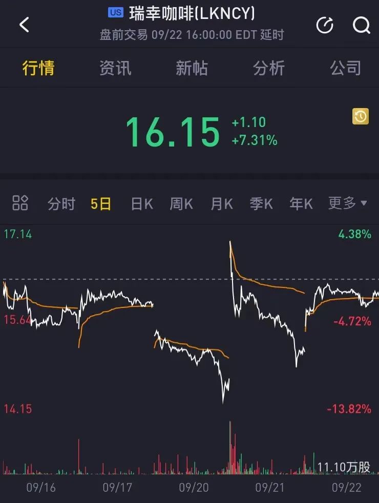 事实上,这个赔偿金额确实远低于此前法律界人士的预估,因此,受上述赔偿与重组消息的影响,9月21日,瑞幸咖啡股价在美国粉单市场(场外交易市场)一度上涨近19%。截至当日收盘涨了3.44%,报价15.05美元/股,市值38亿美元。相较去年退市时1.38美元/股的股价,一年多之间,瑞幸股价暴涨十倍。