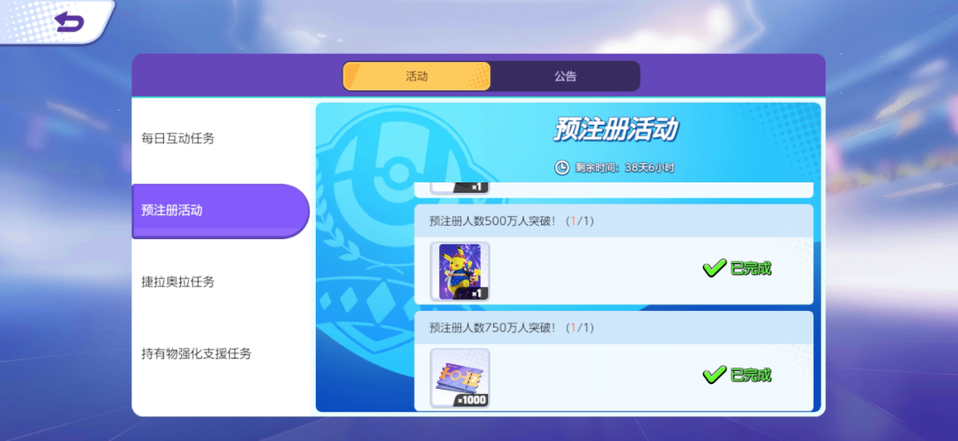 经笔者测试,新近上线的《宝可梦大集结》手游版与Switch版本数据互通,可共享记录(需连接绑定帐号)。根据游戏内预注册活动信息来看,手游版预注册用户已超过750万。