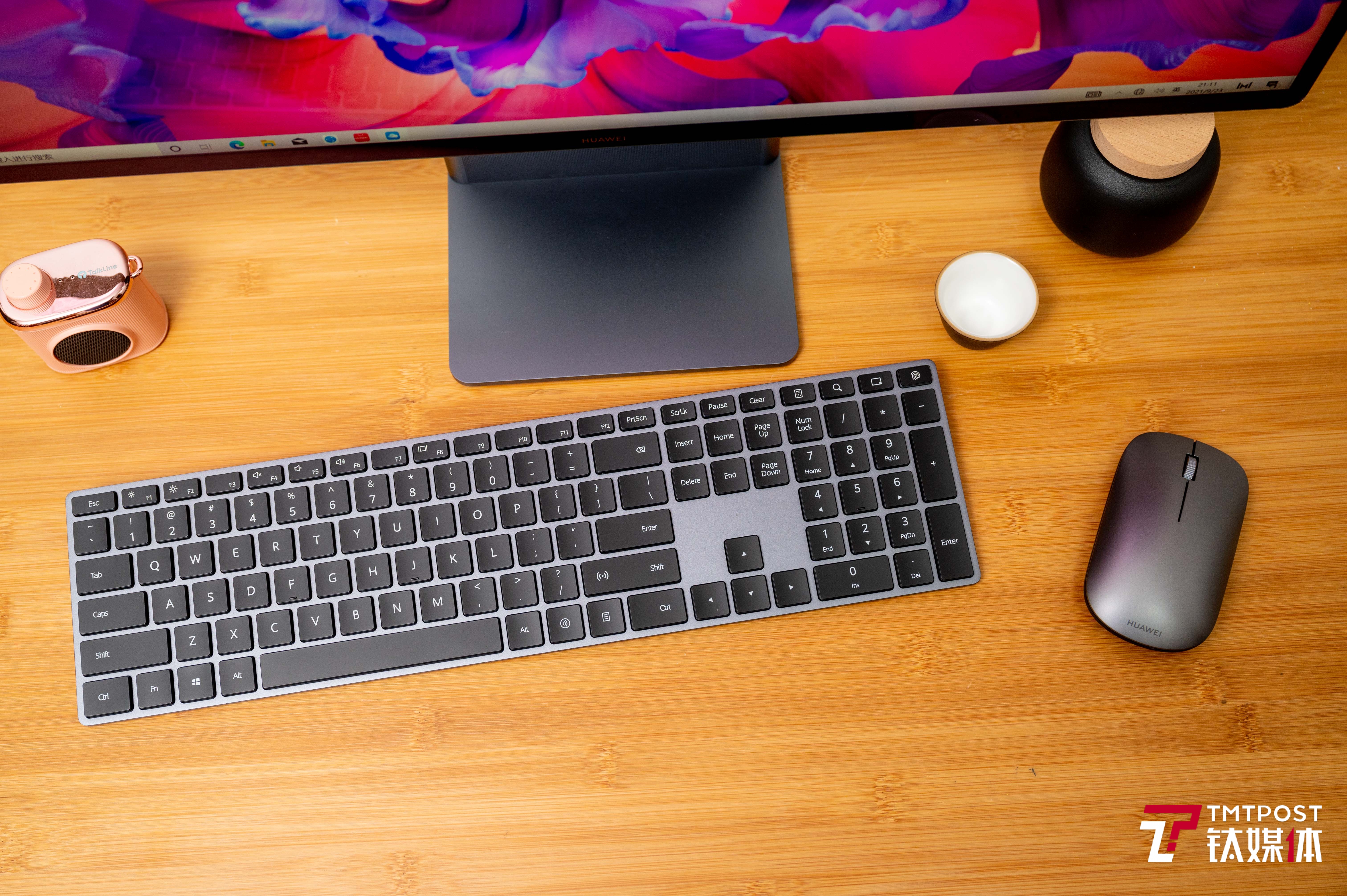 配件方面,华为MateStation X出厂就自带了鼠标与键盘,这两个外设也采用了无线的方式与主机进行连接。其中比较值得一提的就是键盘的设计,它采用108按键布局,通过压缩F1~F12的按键体积以及将额外功能按键布置于数字键盘上方,使得整体的体积更小,按键更加紧凑。