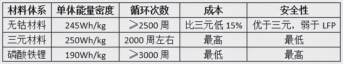 但也有分析认为,长城汽车所谓无钴电池本质上就是镍锰酸锂电池,也就是从三元NCM(镍钴锰)中真正拿掉钴的二元镍锰酸锂(NMx)电池。而从成本、能量密度和安全性三大指标来看,镍锰酸锂电池均处于三元锂电池和磷酸铁锂技术之间,更像是后两者的一个折中方案,其真正市场表现还有待观察。