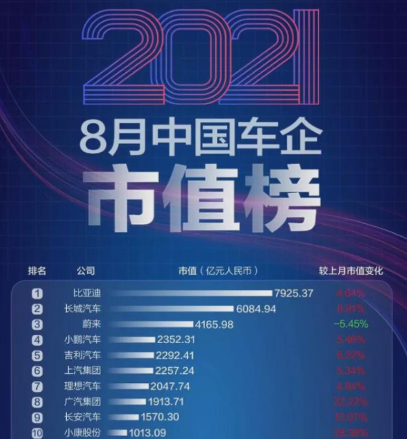 相比长城汽车,比亚迪新能源汽车的热销让其保持着更加强劲的上升势头,也成为二级市场最为看重的一点。截至8月31日,比亚迪市值已经接近8000亿元人民币,继续领跑中国车企市值榜。