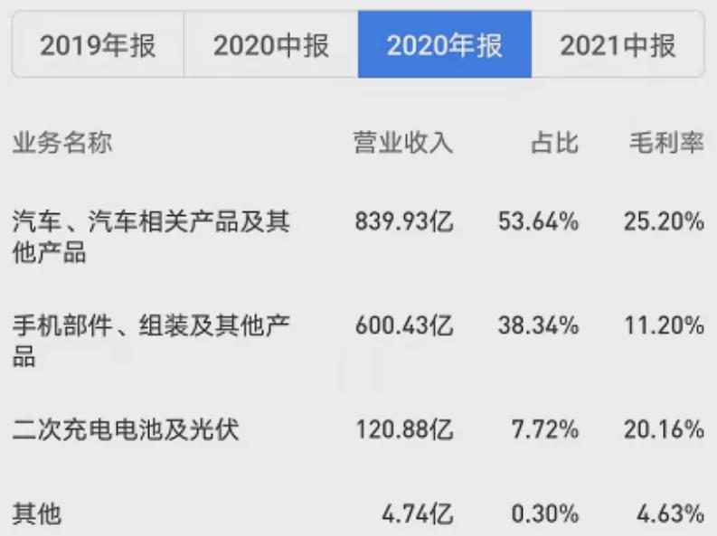 从收入构成上看,比亚迪主营收入共分为汽车业务、手机部件及组装业务、二次充电电池及光伏业务三部分。2020年,比亚迪汽车、汽车相关产品及其他产品业务的收入约839.93亿元,收入占比约为54%。公司手机部件业务、二次充电电池及光伏业务合计占比约为46%。