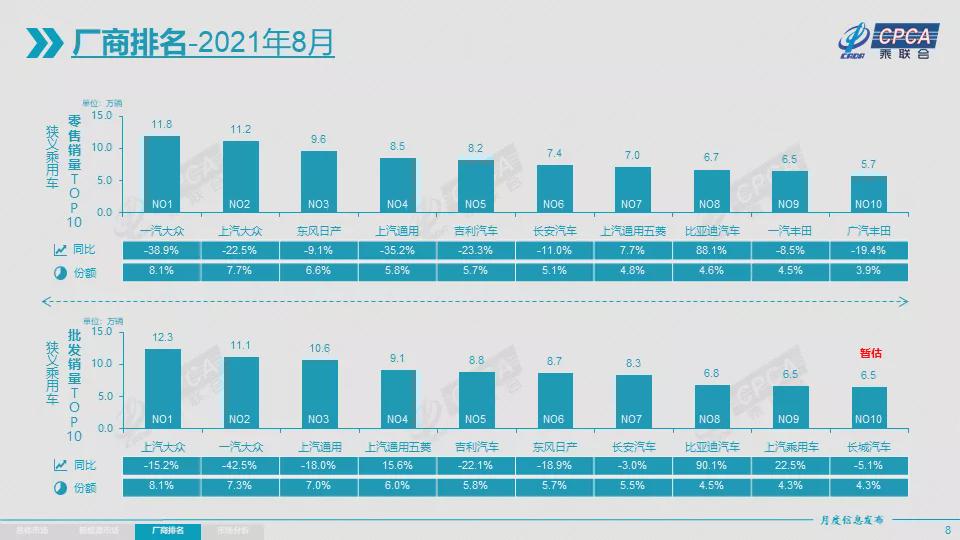 在燃油车低迷、新能源火爆的双重影响下,新能源汽车已成为影响整车厂销量排名的一个关键因素。正是由于新能源汽车的热销,8月份比亚迪以6.8万辆的批发销量进入排行榜前十名,这也是比亚迪时隔多年后“杀进”前十。