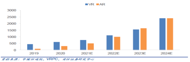 图5:2019-2024E全球VR/AR市场规模预测(亿元)
