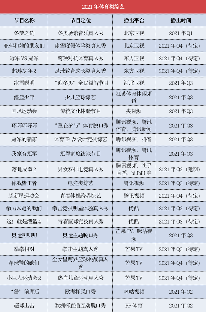 卫视端则先后将主题瞄准了“奥运年”。从公开资料来看,目前列入片单的便有东方卫视的《冠军VS冠军》《超球少年》、湖南卫视的《穿球鞋的她们》、北京卫视的《亚萍和她的朋友们》、江苏卫视的《灌球少年》等,田径、滑雪、篮球、足球同样涵盖多种体育运动。