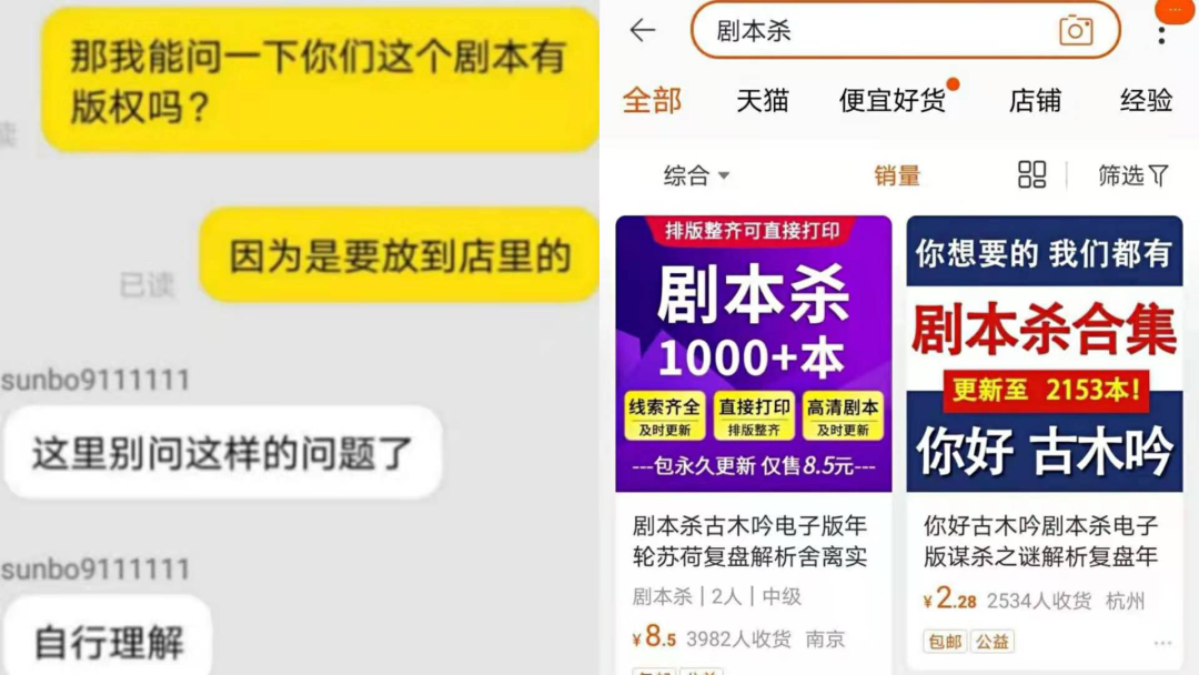 除去内忧,还有外患,盗版的猖獗,又让内容端的盈利状况更加恶劣。为节约成本,不少剧本杀店主会选择从电商平台上购买盗版剧本,只需9块9,就能获得超过2000个剧本的高清电子版。