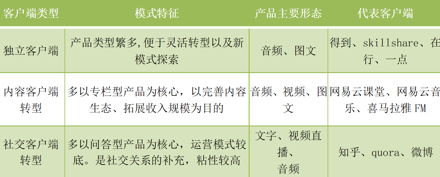 目前,国内知识付费客户端的发展还处于初级阶段,并形成一定行业规模,其发展重点还是在知识产品内容上。目前,国内知识付费客户端大致可以大致分为三类。