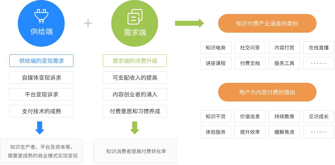 随着移动互联网、移动支付等重要条件的日趋完善,自 2016 年开始各厂商纷纷开始探索知识变现的道路,并逐渐形成规模。知识付费可以看做是传统教育、出版业、咨询行业的高阶演化形式,本质上都是为用户提供知识服务,但在网络时代背景下却探索出了全新的运营模式。