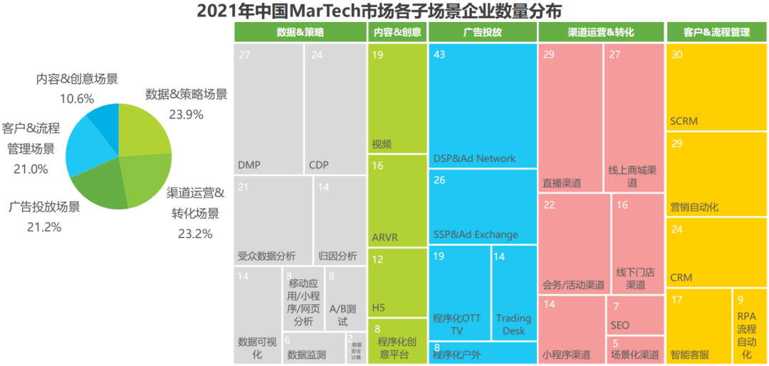 从我国MarTech各子场景企业数量分布可以看到,MarTech在我们认为最具“玄学”性质的内容和创意环节依然占比较少,而在可量化的其他环节都能发挥不小的作用。