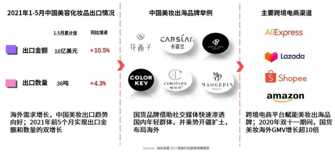 一个共识是,这股崛起的“出海热”正从星星之火转变成燎原之态。数据佐证了这一变化。据海关总署数据:仅2020年前三季度中国化妆品出海总量赶超2018年、2019年全年化妆品出口额。《2021美妆行业趋势洞察报告》同样提及,目前已有25个美妆品牌开始布局海外。
