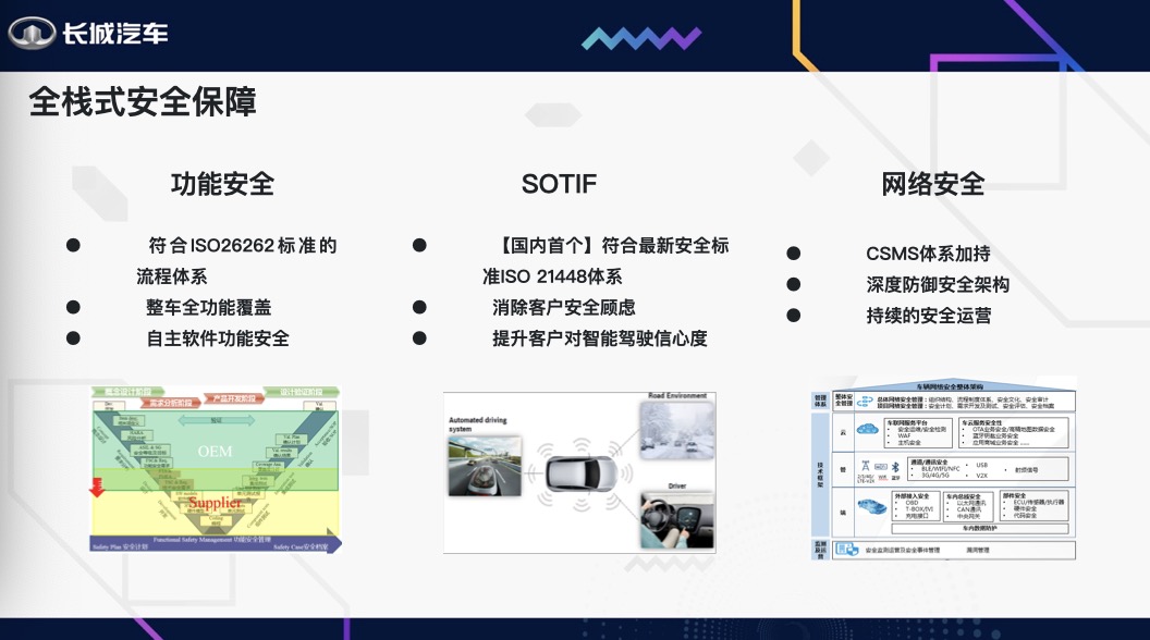 功能安全上,长城汽车融合冗余感知、冗余控制、冗余执行、冗余供电及冗余通讯,最高可满足ASILD功能安全需求。SOTIF(预期功能安全)方面,长城汽车全新电子电气架构符合最新预期功能安全标准ISO 21448体系,覆盖道路环境、自动驾驶系统等方面,有效地消除客户安全顾虑。