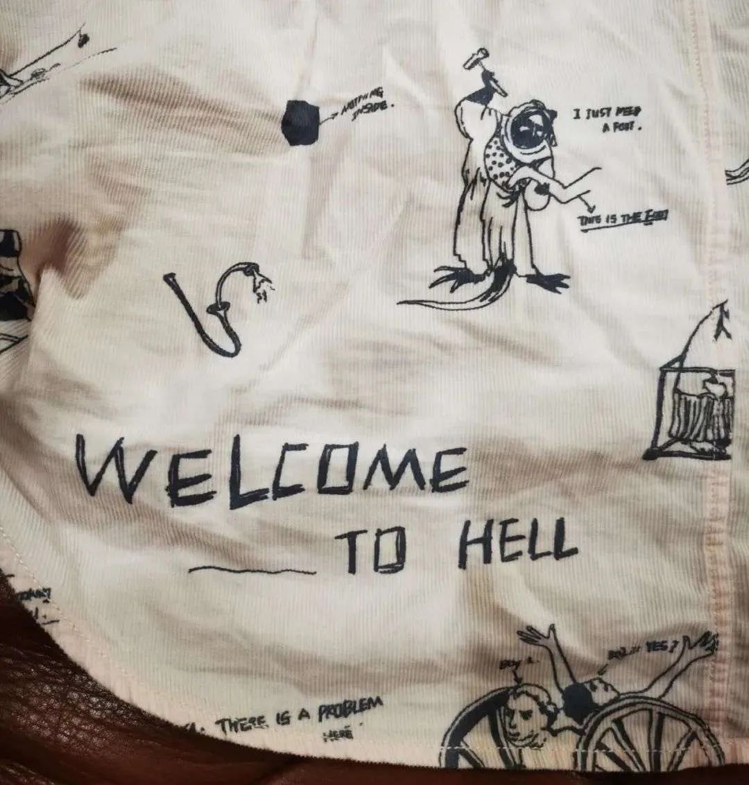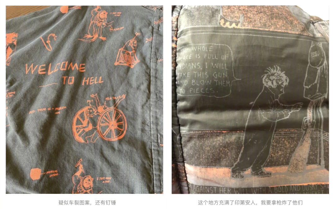 有网友发现,给孩子买的江南布衣童装上,印有很多暗黑文字和诡异图案。童装上的文字为,“Welcome to the hell”(欢迎来到地狱)和“Let me touchyou”(让我摸摸你)。网友认为感到英文语句令人不适。在网友晒出的服装图片上,可以隐约地看到有断肢、暴力动作、祭祀以及恶魔等图案。