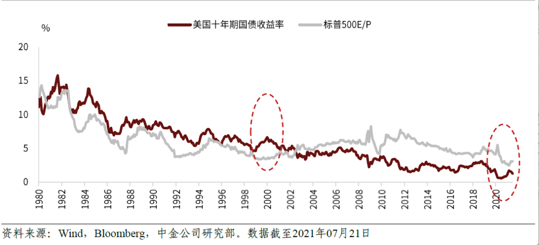 中金公司曾以标普500的市盈率倒数与美国十年国债收益率对比,发现2020年市盈率倒数与2000年互联网泡沫几乎相当,股票市场泡沫相当明显,也就是说,当出于调控通胀目的的加息进行之后,对资本市场将可能是一场比较显著的“挤泡沫”工程,这也是我们对2021年全球资本市场持以审慎态度的重要原因。