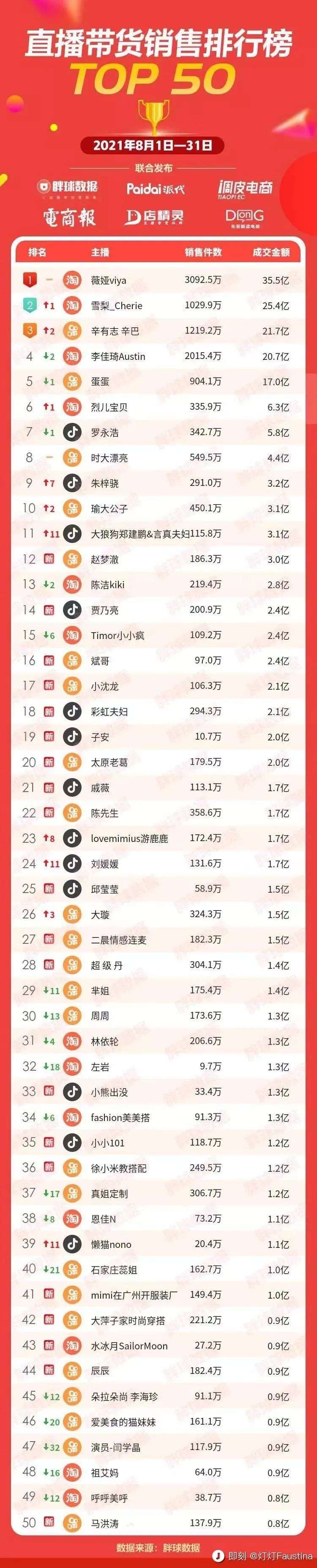 据胖球数据,今年8月,淘宝直播共有13名主播上榜,除雪梨、烈儿宝贝排名上升1名,水冰月Sailor Moon为新登上榜单的主播外,其他10名主播的排名均有不同程度的下滑。