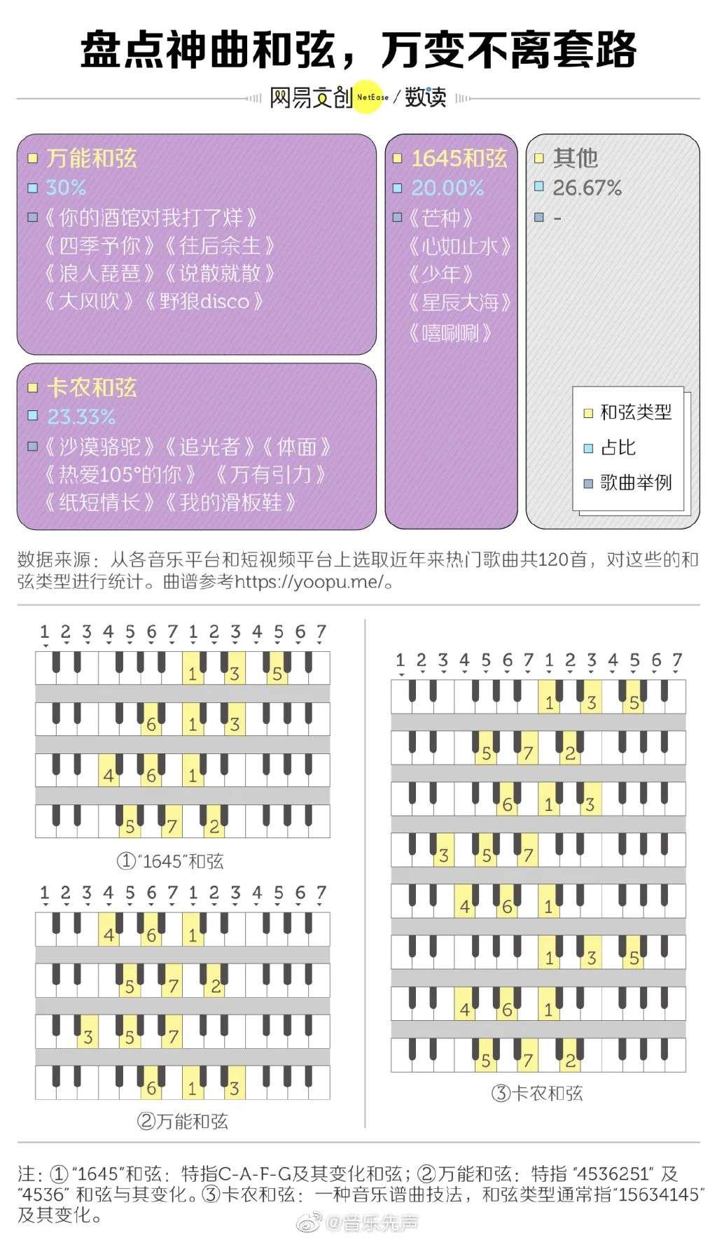 而在对歌曲和弦使用的统计中可以看到,神曲千千万,而用到的和弦主要就三套,即万能和弦、卡农和弦和1645和弦,这三套和弦写成的歌曲在神曲中占比高达73.33%。