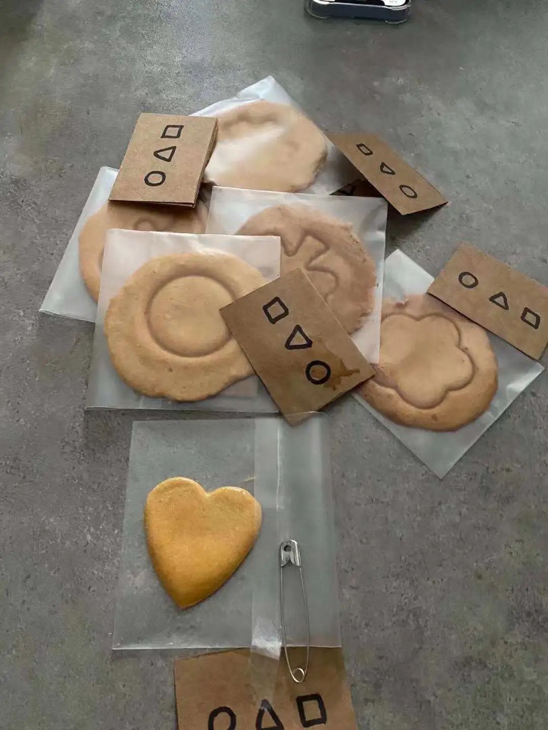 大连的元元也在国庆假期去一家咖啡店买了几个椪糖玩。该店售卖的椪糖图案有三叶草、心形、饼干人三种,每块糖装在一个小袋子里,还会附赠一张印有□○△的《鱿鱼游戏》同款卡片,加上抠糖工具曲别针。