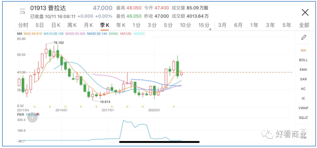 受业绩拖累,普拉达的股价也从2013年78.162港元高点一路下行,在2016年触及近几年最低点16.614港元,堪称“脚踝斩”。
