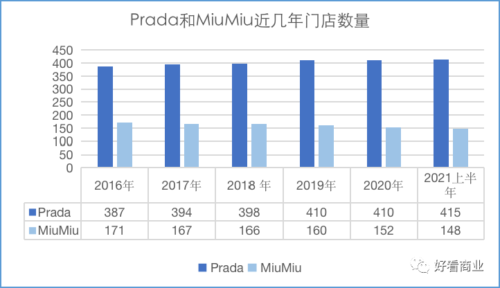 所以,2016-2021上半年,Prada直营门店总数从387家增加了28家至415家;MiuMiu的直营门店一直在缩减,从171家降至148家。