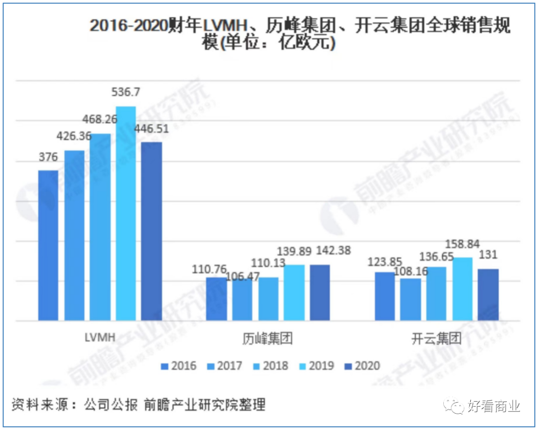 随着全球奢侈品消费规模的增长,全球三大奢侈品集团(LVMH、历峰集团、开云集团)成为受益者。2016-2019年,几家公司的营收持续增长,而且他们的年营收体量都在百亿欧元级,远高于普拉达。