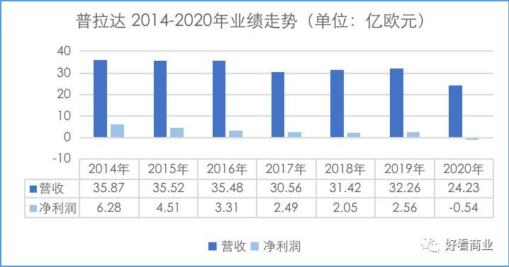 普拉达(01913)财报显示,2014年,公司营收35.87亿欧元,2020年的收入仅24.23亿欧元。过去6年,普拉达的收入体量不升反降,盈利能力却每况愈下,甚至在2020年净亏损5400多万欧元,为上市以来首次年度亏损。