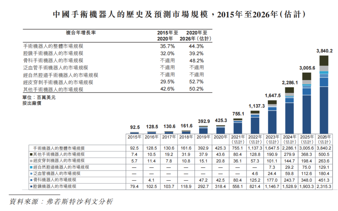 根据第三方机构弗若斯特沙利文的预测,中国手术机器人市场将由2020年的4亿美元增加至2026年的38亿美元(折合人民币达245亿元),复合年增长率为44.3%,领跑全球市场。预期全球市场将由2020年的83亿美元扩大至2026年的336亿美元(折合人民币达2,170亿元),复合年增长率为26.2%。