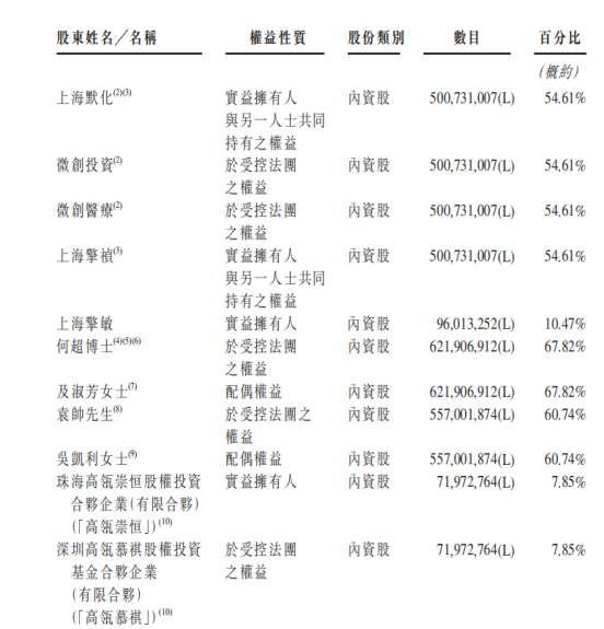 截至2021年3月24日,最新股东结构显示,微创医疗透过上海默化持有52.76%的股份,为公司最大股东;高瓴持有8.05%的股份,为最大机构投资方;花椒树远程医学透过上海常隆持有4.76%的股份;CPE源峰透过天津镕浩持有3.49%的股份;海南贝霖持有1.74%的股份;远东宏信(03360.HK)透过远翼元福持有1.40%的股份;易方达透过数家基金合计持有1.06%的股份。