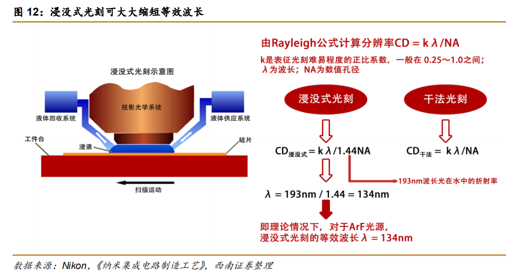 所谓浸没式系统,指的是将透镜和硅片之间的介质从空气换成水。虽然沿用193nm的光源技术,但由于水对光的折射率高达1.44,因此理论上波长能够缩短至134nm,成功突破157nm的技术限制。