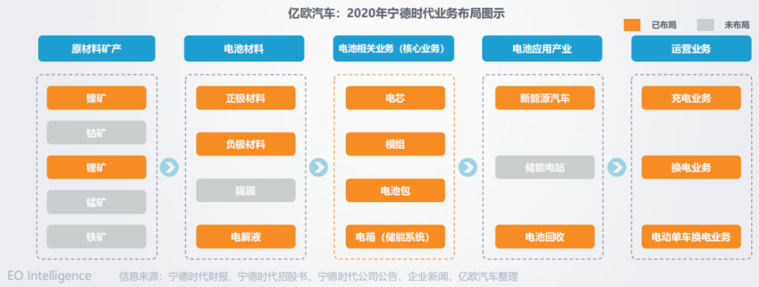 赋能产业链,同样是宁德时代的布局方向。截止目前,宁德时代已经将自身业务延伸至产业上下游,从上游锂矿、钴矿、正极材料、负极材料,到下游新能源汽车、电池回收、充电业务,宁德时代都进行了较为完整的布局。