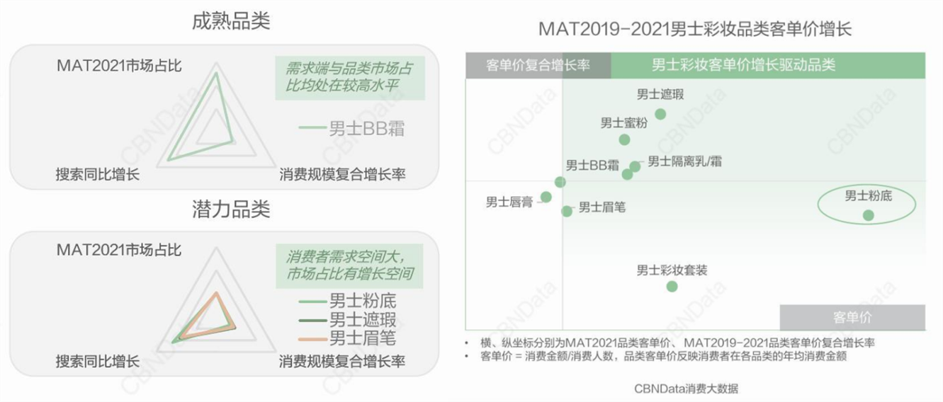 不过近年来,男士彩妆也呈现不断进阶的趋势。就面部彩妆而言,需要搭配美妆工具使用、但持妆效果也更佳的粉底液,以及更具针对性修饰作用的遮瑕棒,近年来需求显著提升。进阶产品在满足男性日益精细的妆容需求的同时,也显著带动男士彩妆客单价的增长——CBNData《报告》显示,粉底、遮瑕、隔离、蜜粉等进阶单品,是驱动男士彩妆客单价增长的主要品类。