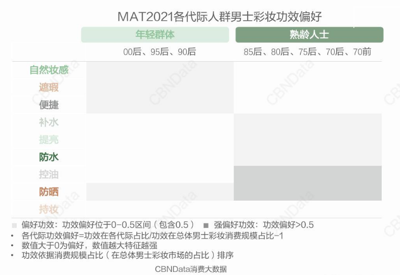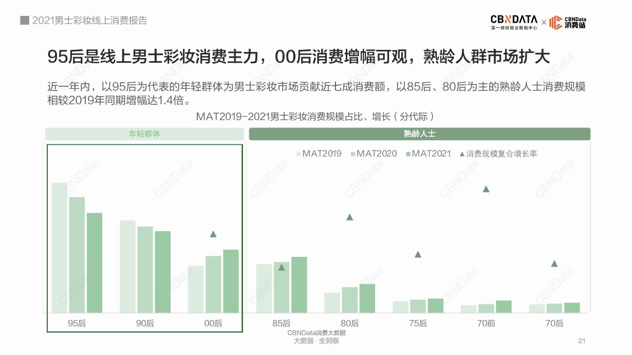 从人群来看,男士彩妆消费由观念前卫、思想新潮的年轻人群引领——CBNData《报告》显示,95后单身男性是线上男士彩妆消费的主力军,其中尤以00后的消费增速最为可观。值得注意的是,以85后、80后为主的“熟龄人士”在男士彩妆消费上的增长尤为显著,其2021年的消费增速是2019年同期的1.4倍。随着整个社会对男性化妆包容度的不断提升,男士彩妆的消费群体正在向更广泛年龄段延伸。