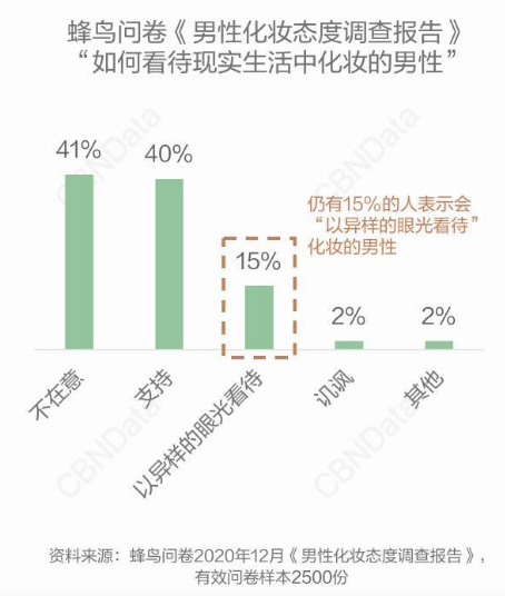 相较之下,中国男性在化妆方面仍存在较多顾虑,这主要源于长期以来社会传统性别思想的束缚,以及社会舆论的负面导向,包括“男生化妆很娘”“化妆被看出来很丢脸”等。蜂鸟问卷的相关调研显示,仍有15%的受访者表示会“以异样的眼光看待”化妆的男性,甚至有2%表示会“讥讽”。