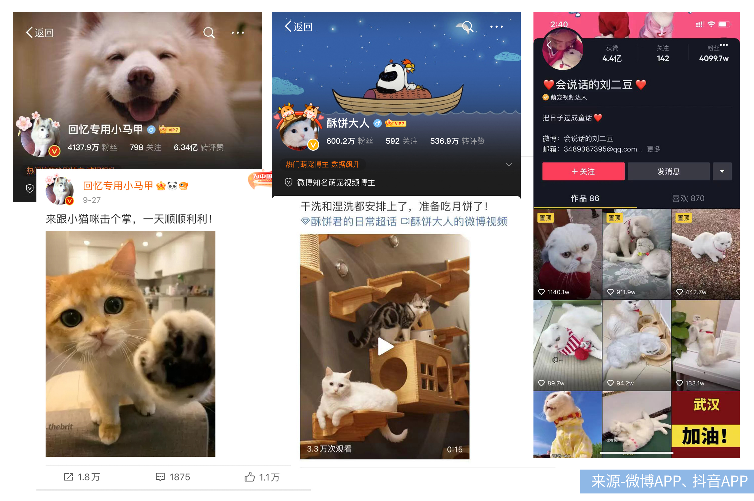 在各类社交平台中,与“萌宠”相关的内容往往能带来超高流量。例如“端午”主人“回忆专用小马甲”是最早的宠物猫博主之一,仅微博便坐拥4138万粉丝;知名美食视频节目《日食记》专门为出镜的猫主子开通了微博号“酥饼大人”,目前有600万粉丝;拥有4000万粉丝的抖音超大V“会说话的刘二豆”,其最高一条点赞视频超过了1000万。
