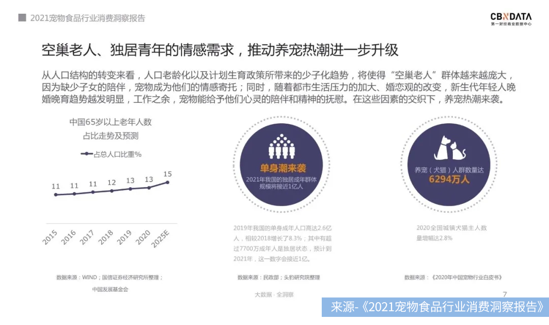 CBNData发布的《2021宠物食品行业消费洞察报告》显示,2021年我国独居成年群体规模将接近1亿,随着都市生活压力加大,婚恋观改变,新生代年轻人在工作之余越来越需要宠物所带来的身心陪伴和精神抚慰;而在当前养宠人群中,有超40%的人群为独居单身人群。