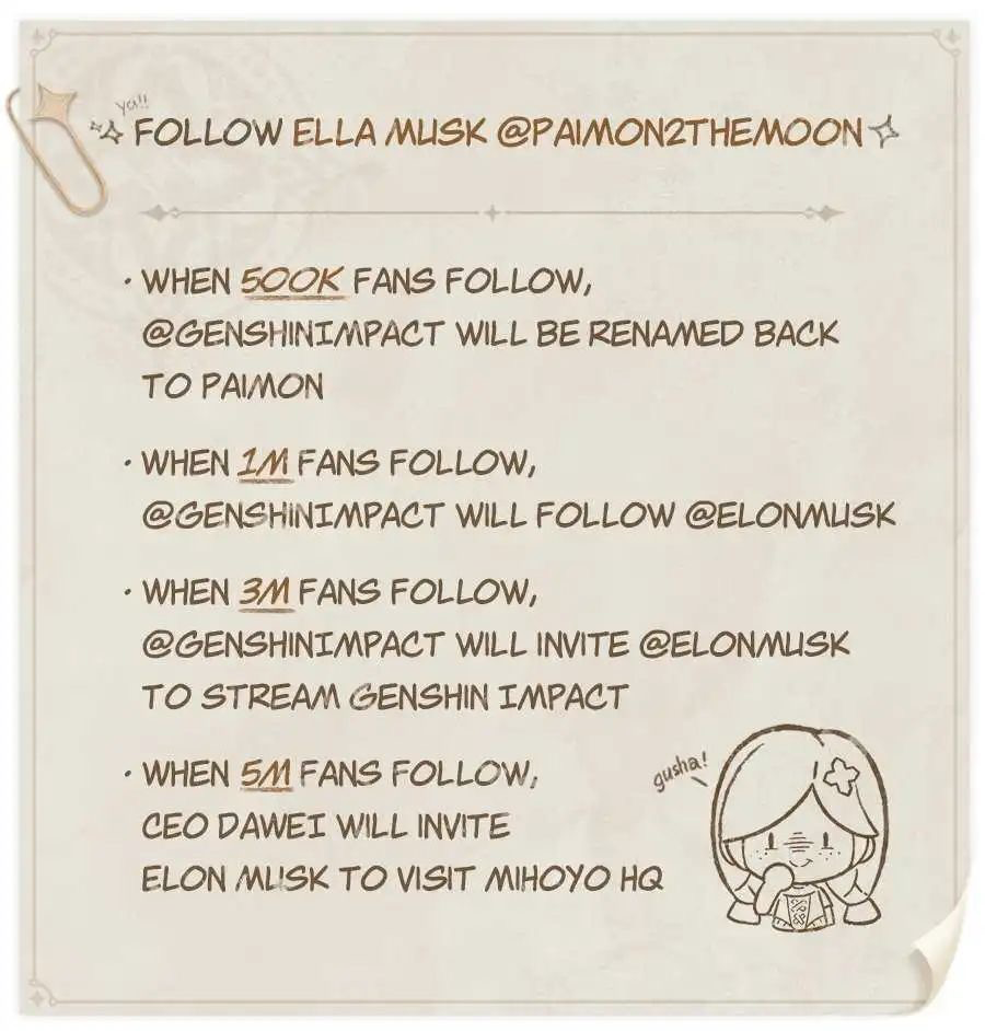 10月14日当天,官方为了庆祝《原神》推特粉丝超过200万人,还发起了一场社区挑战赛:当关注人数达到50万时,官方将ID改回派蒙“PAIMON”;当关注人数高达到100万时,官推将关注埃隆·马斯了的推特;当关注达到300万时,将邀请马斯克直播玩《原神》;当关注人数达到500万时,米哈游CEO大伟将邀请马斯克来上海参观米哈游总部。