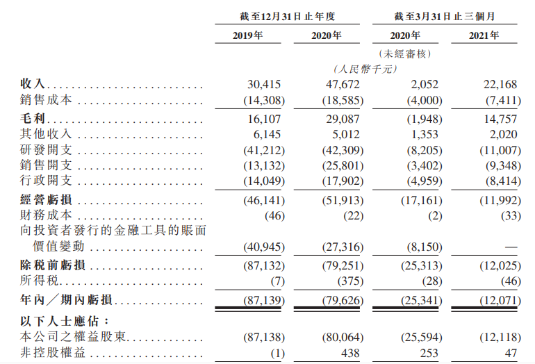 招股书显示,2019年、2020年及2021年前三个月,鹰瞳科技录得营收分别为3041.5万元、4767.2万元和2216.8万元。随着公司核心产品Airdoc-AIFUNDUS的落地以及为公司创下收入,鹰瞳科技2021年前三个月的营收较上一年同期的205.2万元,剧增了980.3%。