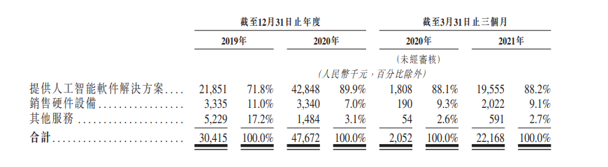 从收入结构来看,提供人工智能软件解决方案一直是鹰瞳科技的营收“大头”,该业务收入在2019年、2020年及2021年前三个月期间分别占比总营收的71.8%、89.9%和88.2%;而销售硬件设备的收入占比分为11.0%、7.0%和9.1%;其他收入的占比有所下降,由此前的17.2%下降至2.7%。
