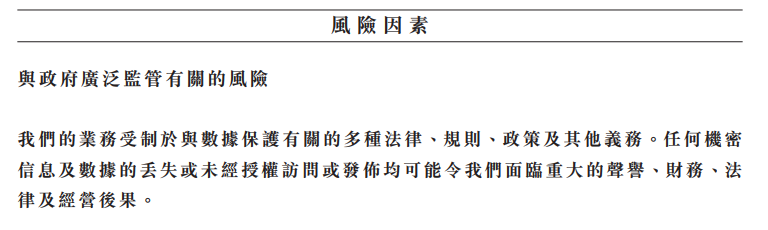 特别是,由于鹰瞳科技的业务受制于与数据保护有关的多种法律、规则、政策及其他义务,任何机密信息及数据的丢失或未经授权访问或发布均可能令公司面临重大的声誉、财务、法律及经营后果。