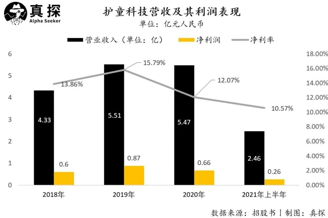 整体营收方面,招股书显示,护童科技2018年至2020年,以及2021年上半年的营业收入分别为4.33亿元、5.51亿元、5.47亿元、2.46亿元,净利润为0.6亿元、0.87亿元、0.66亿元、0.26亿元。