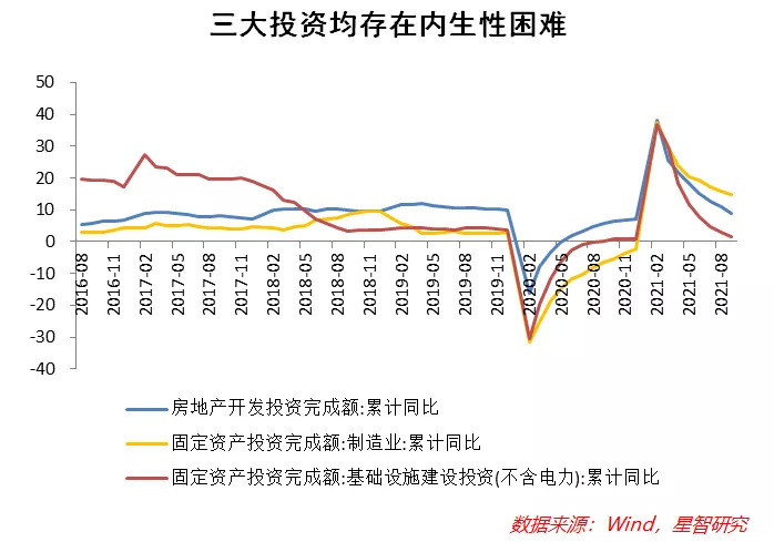 从需求端看,9月社零总额同比增长4.4%,略高于预期,消费在结构性分化问题有所缓解,但耐用品消费逐渐乏力拖累消费总量增速;房地产、基建和制造业投资增速继续下滑,9月累计同比分别为8.8%、1.5%、14.8%,三项投资活动分别受制于房地产融资调控、地方政府投资意愿降低、企业盈利受挤压等因素而难言乐观。