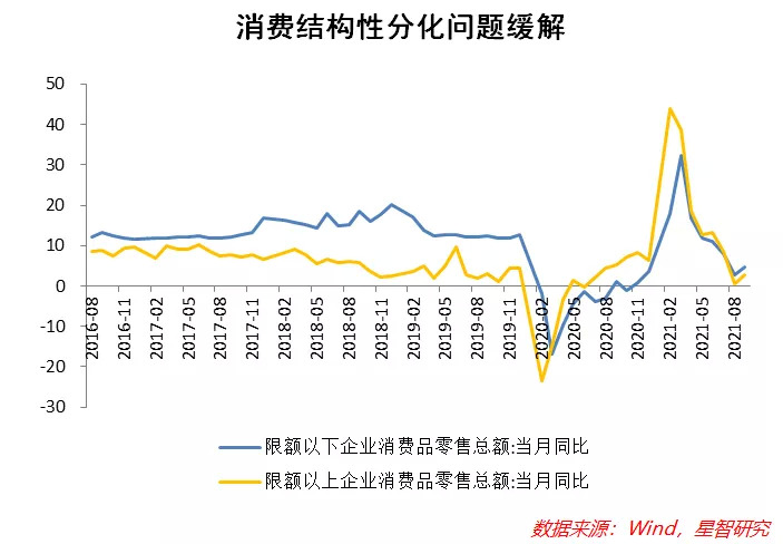 9月社零总额同比增长4.4%,较上月回升1.9个百分点,限额以上零售额增速2.8%,限额以下零售额增速4.62%,显示疫情影响减弱和终端消费回暖,但汽车缺芯问题持续,继续拖累中高端消费。随着价格从上游向下游继续传导,零售企业盈利和营收可能会边际改善,带动社零总额缓慢回升。