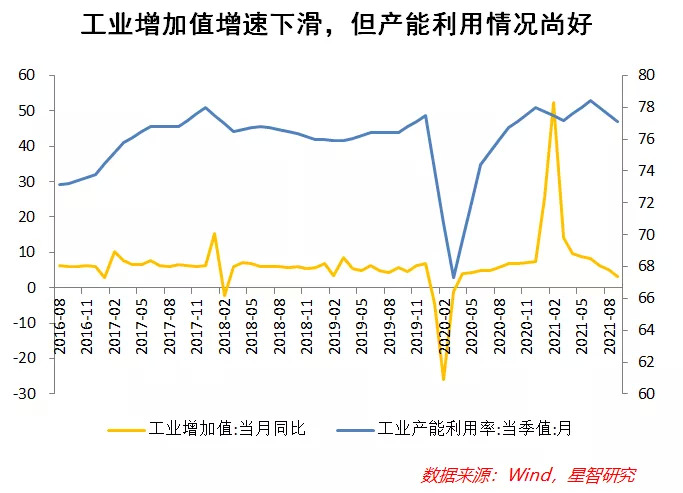 9月工业增加值同比增长3.1%,能耗双控政策短期内大大压缩了工业活动。由于限电停产具有行业的普遍性和蔓延性,且集中于中上游工业。未来增长将处于继续外需拉动与限产和涨价的拖累这两方力量的拉扯中,由于限产和涨价的持续性似乎更强,而外需则面临全球经济的不确定性,未来工业生产恢复趋势倾向于弱化。不过从产能释放角度看,工业企业面对订单,在限电停产的困境下依然坚持了相对正常的生产活动,预计未来产能利用情况能够保持较高水平。