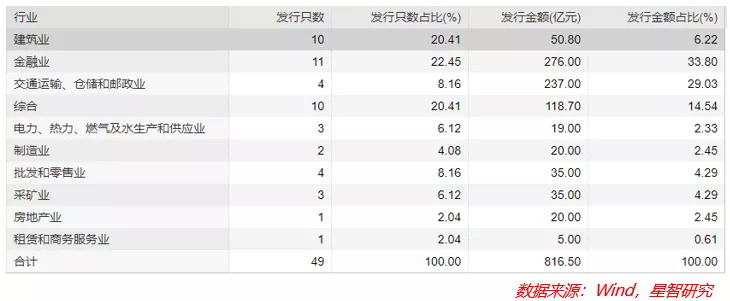 分行业看,除金融业外,共发行540.5亿元,交通运输、仓储和邮政业、综合业、建筑业发行金额占比较靠前。