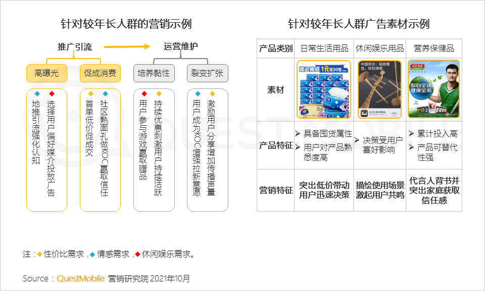 2.3针对较年长人群的营销重点满足其“性价比” 需求和信任、社交、成就感等“情感” 需求,广告素材以贴近生活和赢取信任感为主要特征