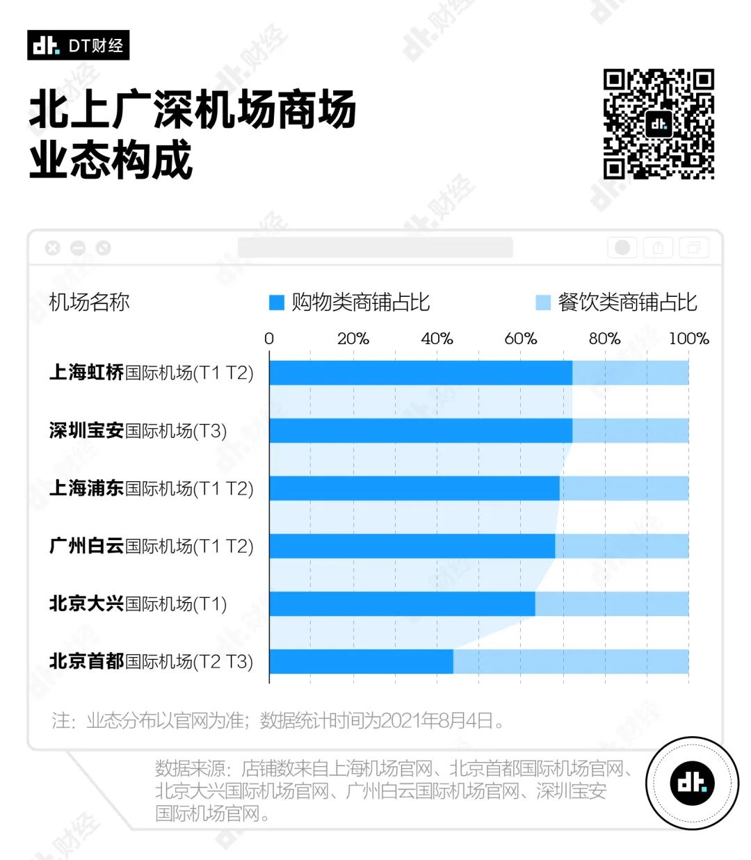 因此,接下来DT君将按照从北到南的地理位置顺序,对北上广深6个机场商场的具体业态构成以及品牌进行分析,希望刻画出不同机场商场的真实面貌。