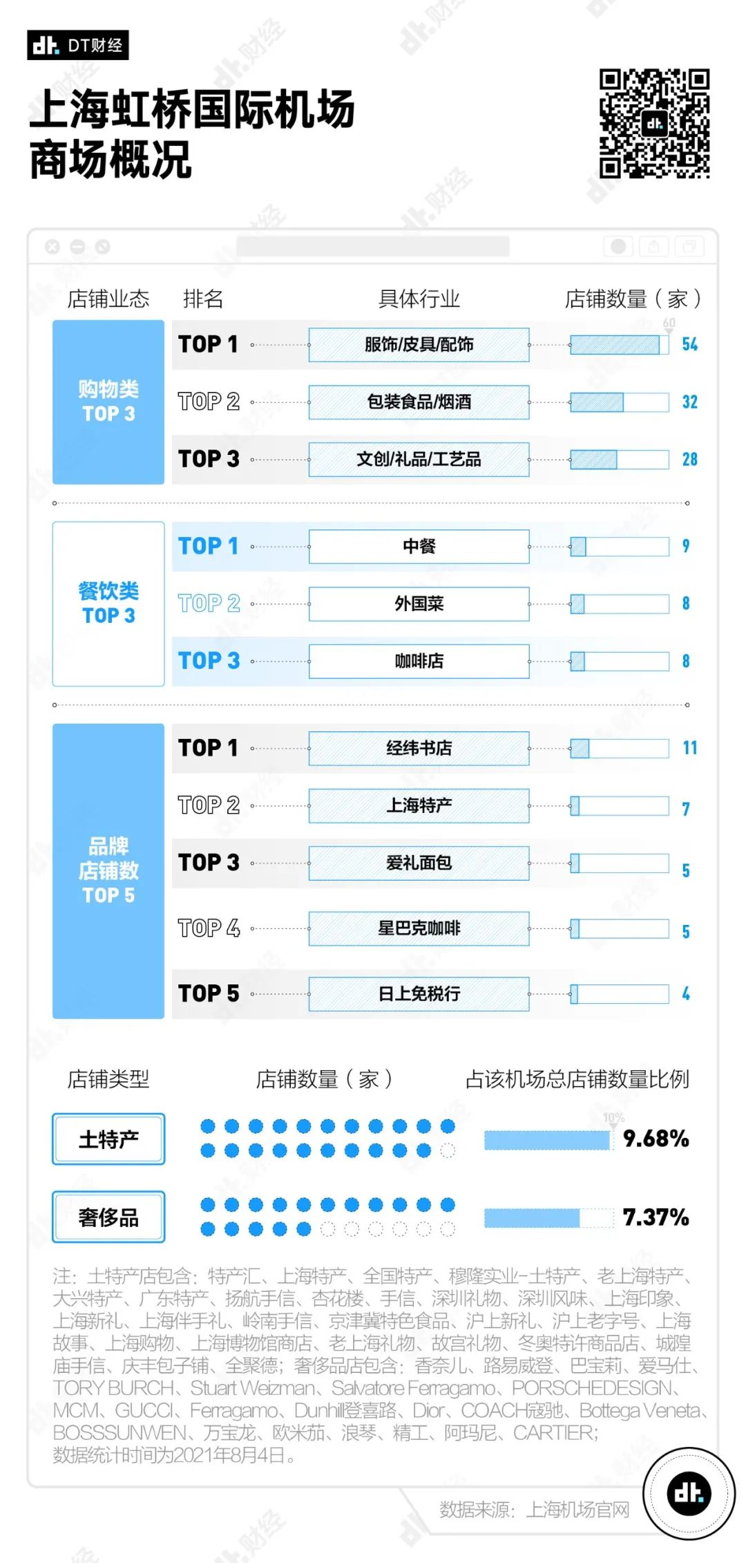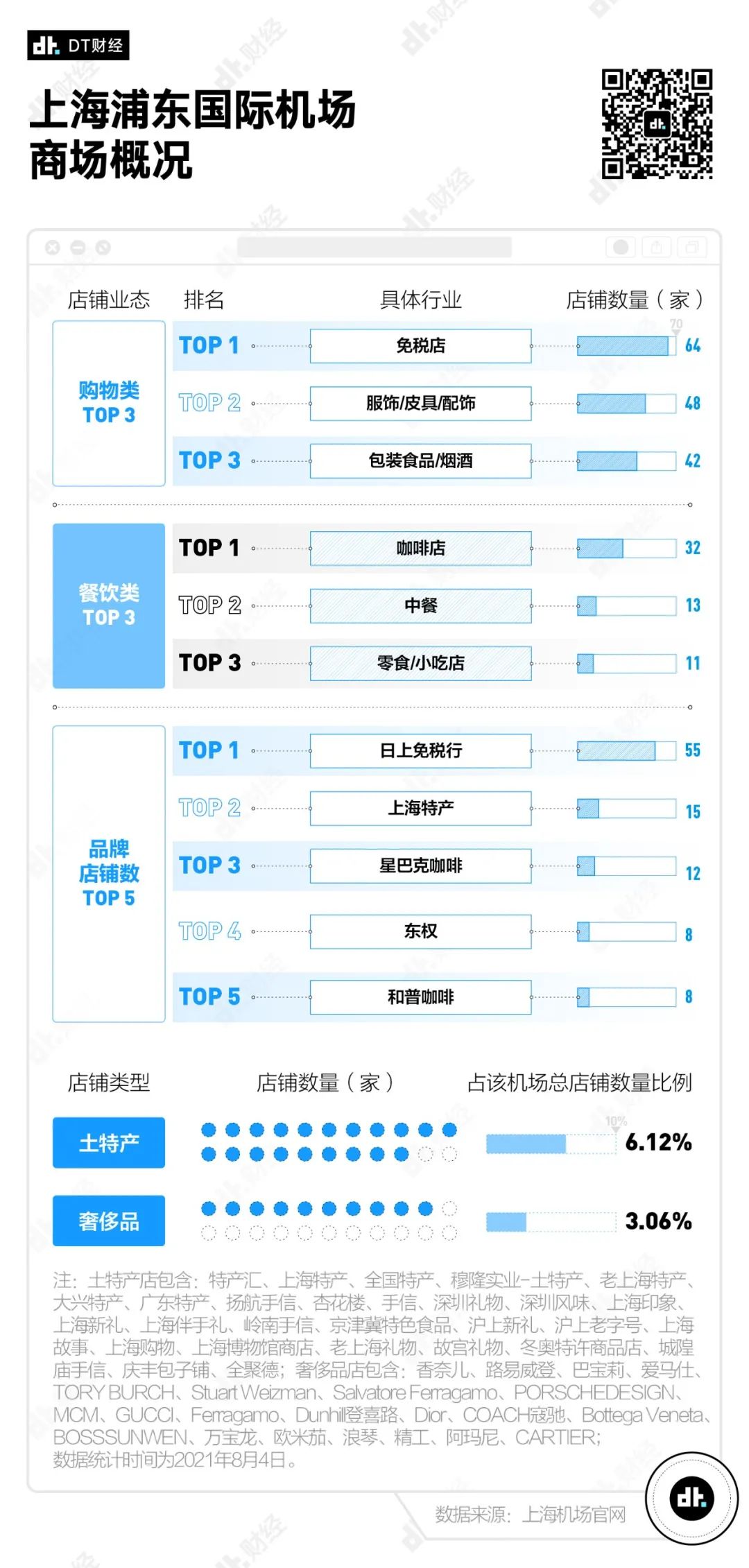 与首都机场形成对比的是上海浦东机场。同样作为中国顶级的大型枢纽,浦东机场虽然在每万平米店铺数上输给了隔壁虹桥,但在店铺总数上遥遥领先其他5座机场。上海对于机场商业的开发能力,似乎仍然是独一档的存在。