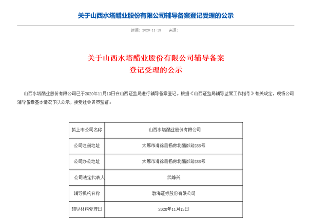 到了2020年11月,水塔醋业突然更换辅导券商。根据山西证监局官方显示,渤海证券担任水塔醋业新的辅导机构,重新在山西证监局进行备案登记。