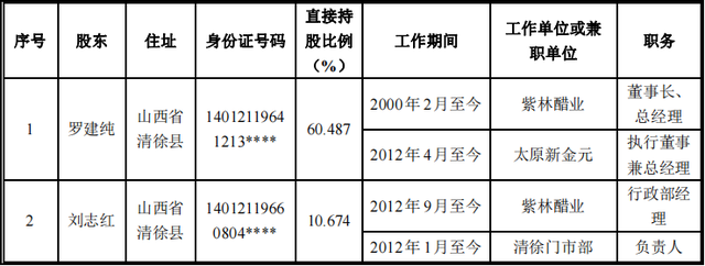 招股书中提到,紫林醋业创办于2000年2月,前身是山西省清徐金元老陈醋有限公司,由罗建纯、刘志红夫妇出资60万成立。